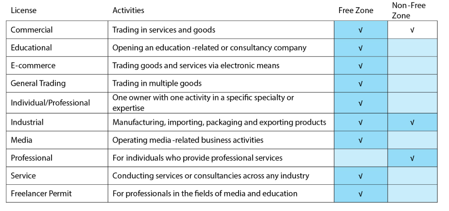 RAKEZ offers variety of business licenses covering an array of activities as per the table below